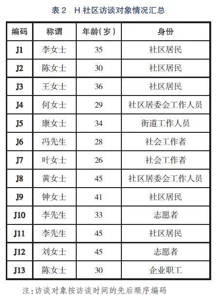 本研究对H 社区居民参与垃圾分类开展实地调研,采取半结构式访谈法,选取13 位访谈对象进行访谈,从不同行动者层面了解其对社区居民参与的认知、态度,以及相应的参与行为。访谈对象中,有五位社区居民、三位社区工作人员(街道和社区居委会的工作人员)、两位社会工作者、两位志愿者(社区社会组织成员)、一位企业职工(社会慈善资源),具体情况见表2。