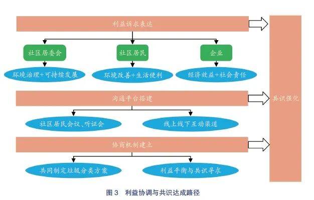 在H 社区垃圾分类推进过程中,利益协调与共识达成是实现社区居民有效参与的关键环节。通过翻译与转译,多元行动者的需求、利益和目标被转化为共同的行动方向,具体路径如图3 所示。