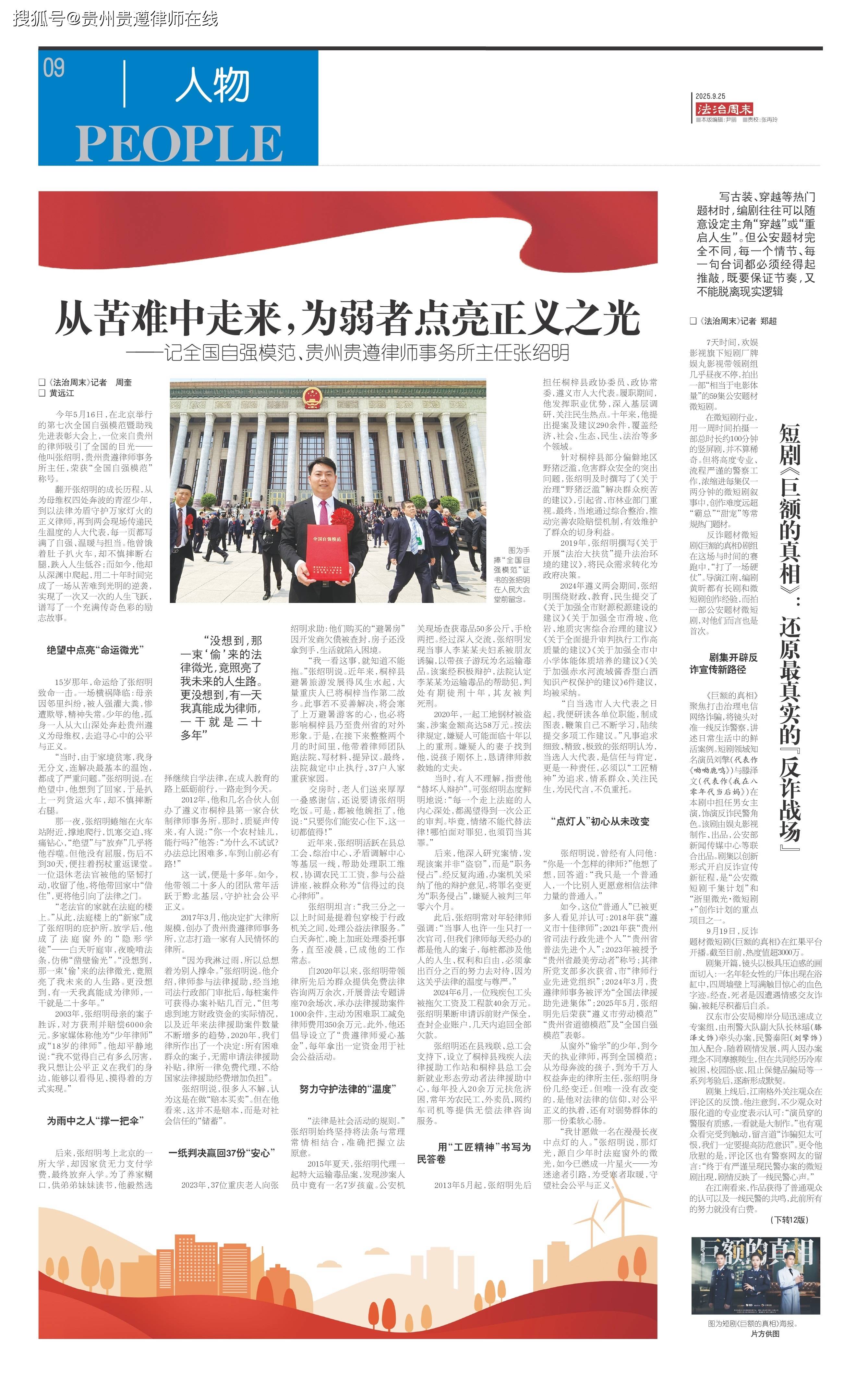 据悉,在9月25日出版的《法治周末》(9版)上,将以 “封面导读”+“成长专访” 的显著形式,专版刊发贵州贵遵律师事务所主任张绍明律师的成长故事。